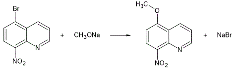 К раствору метилата натрия, приготовленному растворением 11,5 г (0,5 мол.) натрия в 1500 мл сухого метилового спирта, добавляют 208 г (0,427 мол.) 5-бром-8-нитрохинолина. Смесь выдерживают при слабом кипении в течение получаса, после чего её охлаждают и фильтруют, получая 72 г (81% теоретич.) продукта. Вещество очищают перекристаллизацией из толуола с прибавлением обесцвечивающего угля и дальнейшей перекристаллизацией из смеси диизопропилового эфира с бензолом или абсолютным спиртом. Чистое вещество представляет собой бледно-жёлтые кристаллы, плавящиеся при 117,5—118°.