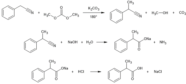 3. Диметилкарбонат применяют в большом избытке (15-кратный по отношению к цианистому бензилу) и как метилирующий агент, и как растворитель. Прошлые исследования показали, что диметилкарбонат является подходящим полярным апротонным растворителем. Весь избыточный диметилкарбонат можно регенерировать перегонкой. Можно также применять каталитическое количество (0,05 мол. на 1 мол. нитрила) поташа, но это существенно замедляет ход реакции.